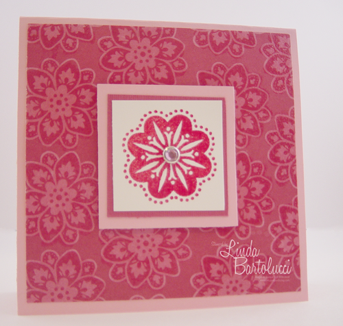 As for the center of the card…I started with a layer of Pretty in Pink and put Rose Red on top of that.  The image is embossed on Whisper White and includes a pink Fire Rhinestone Brad in the center.