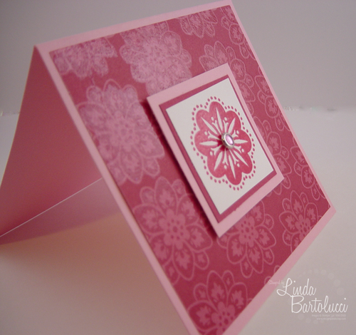This card uses Pretty In Pink card as its base.  I layered a square of Bali Breeze Designer Series Paper after I colored each flower with the Versamarker and clear embossed them.  I've included a picture here that better illustrates this.Blog20070109a You can see in the lower picture that the flowers on the background paper are embossed and so is the center flower.  I don't have Rose Red embossing powder and I don't have Rose Red Craft Ink, but I do have the classic pad and the Versamark pad.  When you combine the latter you are once again able to clear emboss.  Be sure to ink in the Versamark FIRST and then the colored ink – otherwise your Versamark will be a mess!