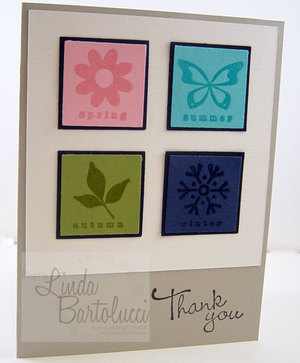 We had a great time creating this card at our Technique Class in April. This is using the Perrenial Favorites and Much Appreciated stamp sets. The "Thank You" is stamped in black on sahara sand. I used a white rectangle with the black matting to make the images really POP! Each season is stamped in versamark and then clear embossed using a heat gun. This four-up square layout is a great one to use with many stamp sets.