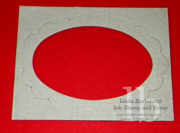 I ran the On-Board chipboard (large book pieces) through the Big Shot with the Scallop Oval Bigz Die. I pulled out the oval and used transparent tape to keep the scallop oval in its place. This became a layer in my "sandwich" when I used the Big Shot. I placed it underneath the Finial Press Embossing Folder. It really makes a great addition to using the Big Shot and Embossing Folders.