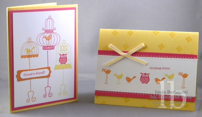Now for today's sample. I trade cards with a good friend in VA who is a very successful demonstrator. Kathleen made these cute cards – hope you like them!