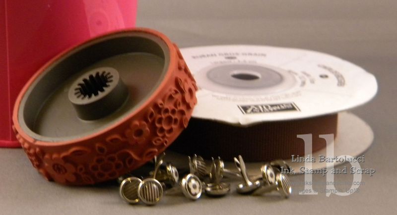 It's Friday! Time for blog candy! Pictured below are some acrylic brads, a spool of chocolate chip grosgrain ribbon and one of the new wheel builders. All you have to do to be entered into my drawing is two quick easy things:
