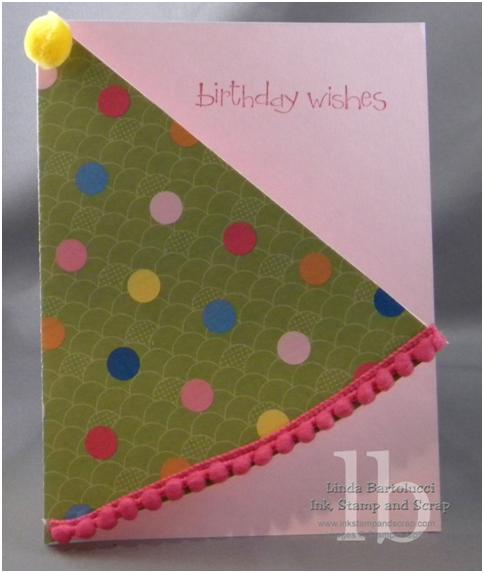This is a card my friend Joyce made. It uses the So Happy for You set that is FREE until March 31st with a $50 purchase. I love how she made the front of the card look like a hat! This card also uses the Ice Cream Parlor DSP which is another item you choose for FREE during the Sale-a-Bration promotion. The final touches are the Pink Pirouette cardstock and the Melon Mambo Trim. I hope you like it.