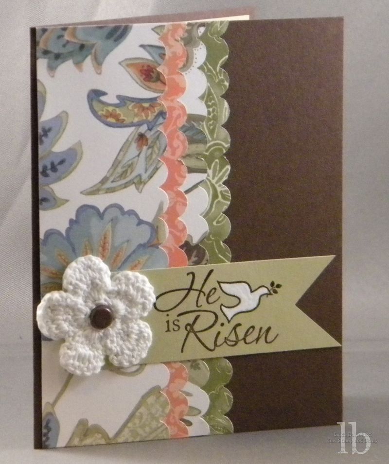 Accessories: Flourettes, Large Brads, Choclate Chip craft ink, Clear Embossing powder, Heat Embossing tool, Uni-ball White Gel Pen, Scallop Border Punch.