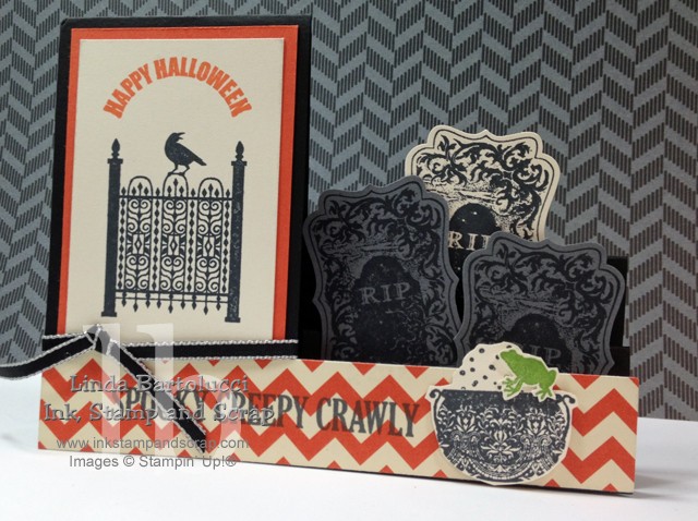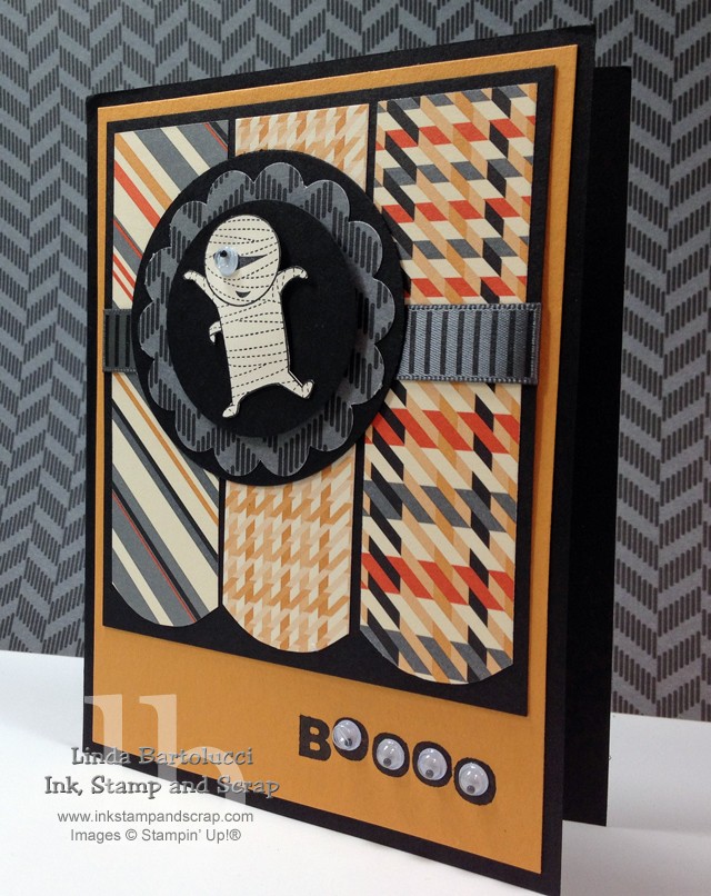 This card showcases the Howlstooth and Scaringbone designer paper so well.  I love the one eyed mummy.  Think I will be using him for tomorrow's sample…