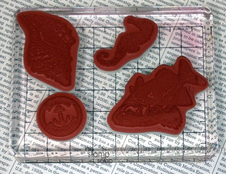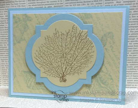 This card uses the Collage Technique. This is an oldy-but-goody where you just keep repeating coordinating stamps to make a unique background. I used the anchor, sea horse, fish and sea shell to create the base for my collage. Then I used the beautiful script stamp and stamped it over the sea creatures repeatedly.